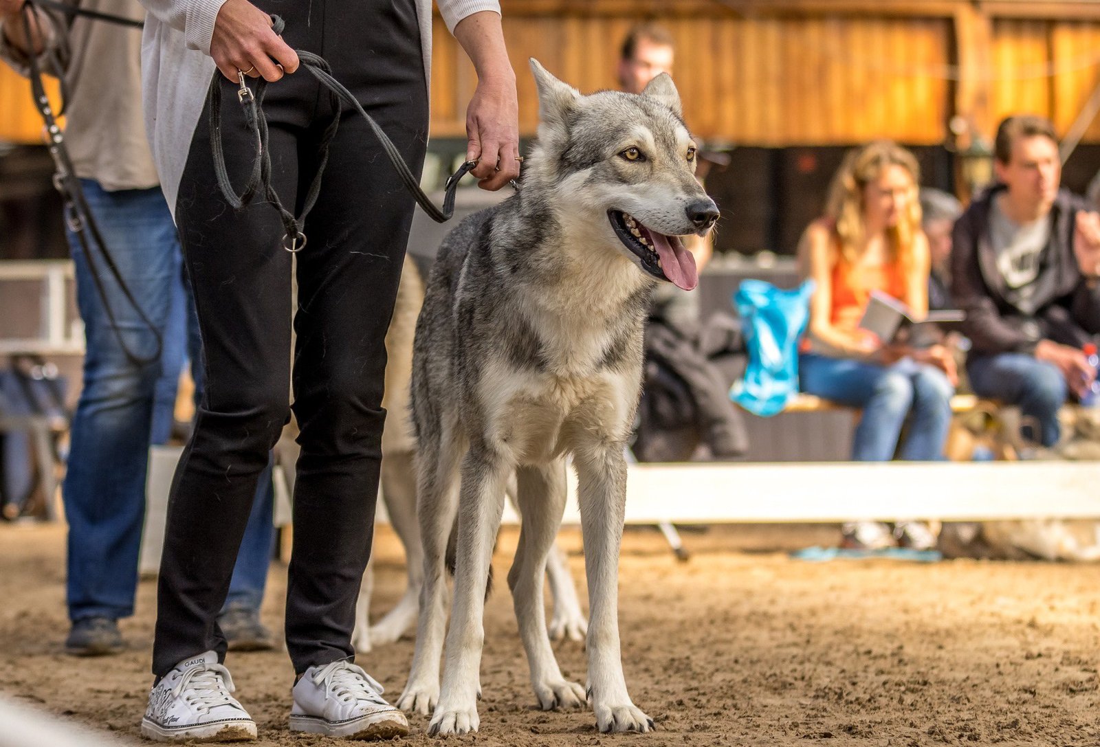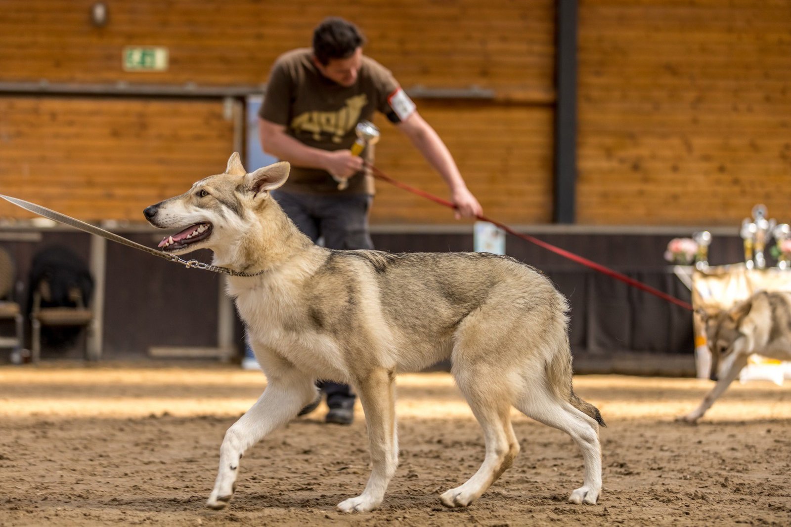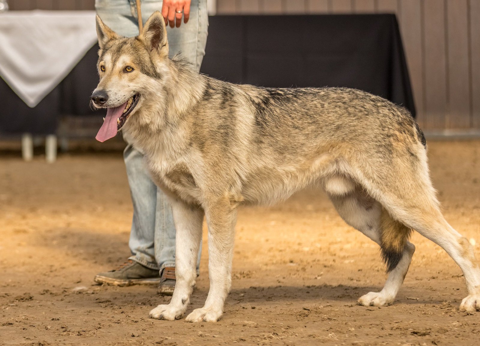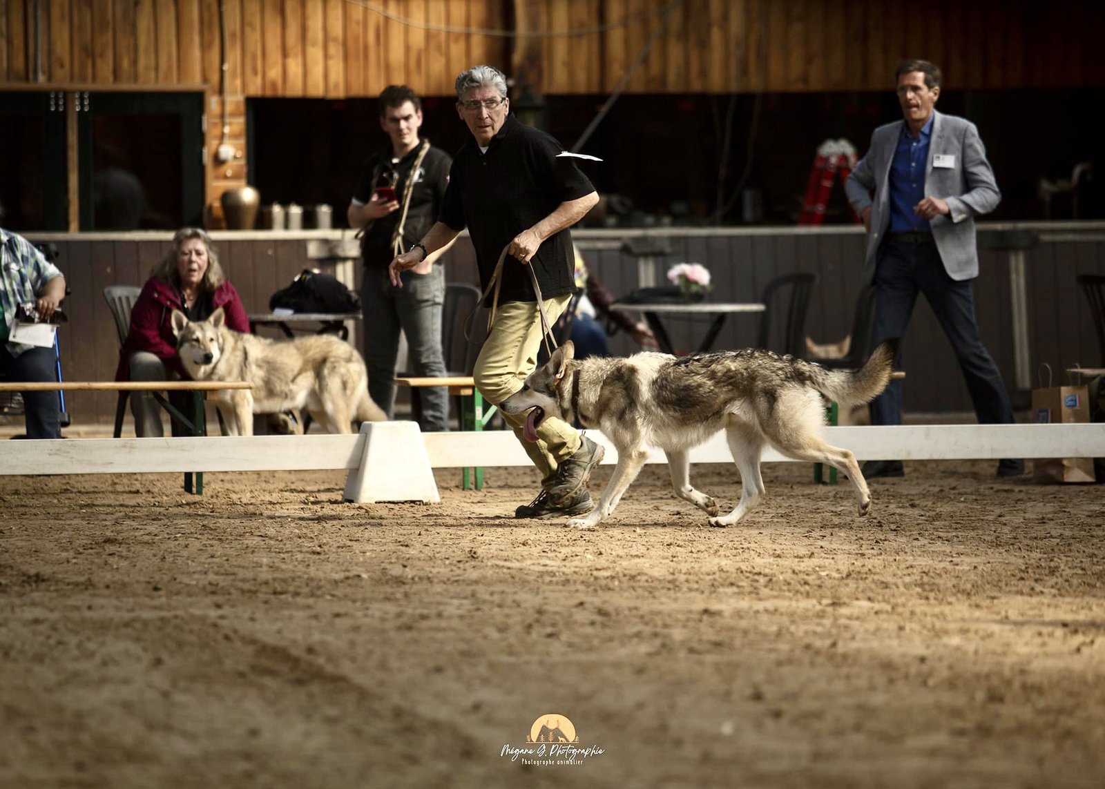 Participer au KCM est aussi l’opportunité de voir des couleurs rares de Saarloos comme par exemple, le blanc (même si personnellement, je n’ai jamais été attiré par cette couleur qui, de mon avis, retire complètement le masque et les marquages qui font penser au loup). Nous avons pu également voir quelques chiens issus du programme outcross de l’AVLS et de la NVSWH.