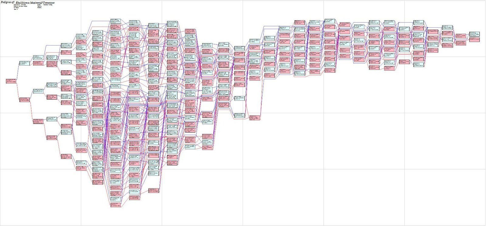 Voici le PedChart d’un mâle de la NVSWH (population Hollandaise fermée depuis les années 80). A gauche, le mâle étudié, à droite le couple fondateur Gérard et Fleur. Ce pedchart représente moins d’une vingtaine de générations. Cette vue globale jusqu’aux fondateurs aurait été impossible à obtenir au travers de pédigrees classiques.