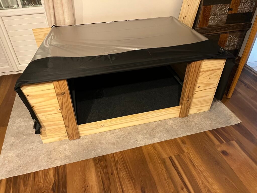 Une toile noire occultante a été tendue sur le dessus de la caisse de mise bas afin de créer une tanière et un rabat supplémentaire tombait sur l’entrée afin de laisser la chienne sortir et rentrer facilement.